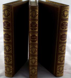 First edition. Three volumes. 12mo. Bound in a fine early 20th century full brown crushed morocco Riviere binding, gilt titles and decorations to spines. All edges gilt, marbled endpapers, gilt inner dentelles. Binding shows very minor wear, a few light scuffs to corners, and few small spots to volume III. While often lacking, the half titles are present, vol I and III appear to be supplied from a second edition. Volume I: minor chips to pages 143/144 and 157/158; and a few minor creases to gatherings M and N. Volume II: tiny tear to rear flyleaf, small tear to outer margin of page 77. Some very minor scattered spotting. Volume III: small repair to upper corner of page 129, repair to lower corner of page 137/138, tiny pin hole to page 259/260. A beautiful, clean and very attractive set. Gilson A3. Austen’s second work, Pride and Prejudice, is her most famous and one of the most popular books ever written. The unforgettable story of the Bennet sisters quickly sold out of the first printing, and editions of this 1813 original are very scarce. Austen was highly praised by Sir Walter Scott, among others, for her proficiency in describing human emotions and the complexity of relationships. Pride and Prejudice established Austen as one of the most relevant and important female writers of her time, and it’s popularity is a prime example of why she is so highly regarded even today.