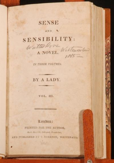 A smart and highly collectible First Edition of Austen’s classic novel, complete in three volumes. Rebound in half-leather with spine labels, gilt lettering and decoration, and marbled paper-covered boards, with a cloth-covered slipcase. Published under the pseudonym, ‘A Lady’. With facsimile half-titles in each volume, and a facsimile title page in volume I. Bears Walter Hore’s signature on the first page of volume I, and dated inscriptions on the title pages of volumes II and III. Condition: Overall a good unmolested copy that has not been cleaned or restored and would come up a treat in the hands of a professional restorer. A pleasure to see a copy of this important work before the attentions of a restorer so that the purchaser can decide on how far to restore and know what has and has not been done. Rebound sympathetically. The bindings are tight and firm. There is very little wear to the extremities or to the slipcase. Internally the pages have light scattered foxing throughout, with occasional marks and mild browning. In volume I there are some closed tears and chips to the lower margins of the first quarter, with the lower corners of a couple of pages missing, not affecting text, a hole to the margin of page seventy-one, and repairs to closed tears on a few pages and to a split across page sixty-five. There are stains to the top corners of pages 292 and 293, and 158 and 159. In volume II there is light ink staining to the margins of pages 114/115, which does not affect the text. The bottom corners of a couple of pages are missing, and there is a small hole to the margin of the last page, none of which affect the text. The lower corner of page ninety-one is missing and has been repaired,with the loss to the text replaced in handwritten ink. The lower section of page 139 has been repaired, with the last four lines handwritten on both sides. In volume III there is very slight evidence of damage to the lower margins of the title page to page forty-four. There is also an ink mark to page sixty-three and smudged early copper-plate notes to the top margin, and a note to the top margin of page fifty-nine. With a small tidemark to the outer margin of 149, chips to the lower margins of pages five to nine, and closed tears to the lower margins of several pages. The lower corner of page nineteen is missing, and there is light staining to the lower corners of pages 102 and 103. There are small holes to the lower margins of pages 159 and 161. A small section of the first page of volume I has been removed, and small sections of the title pages of volumes II and III have been removed and repaired. Overall the condition is very good with a good interior.